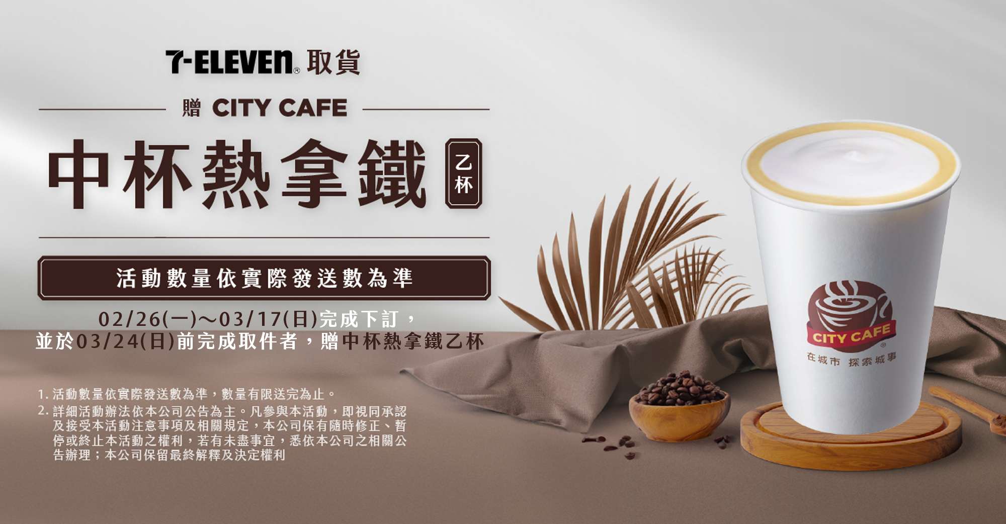 於活動時間內 ( 2024 年 02 月 19 日起至 2024 年 03 月 17 日止 ) 完成下訂並於 2024 年 03 月 24 日 23:59 前 在 7-ELEVEN 完成取件者,即享有獲取資格 ( CITY CAFE 中杯熱拿鐵 乙杯 ),贈送對象將於 2024 年 03 月 27 日起至 2024 年 04 月 05 日止 依實際完成取貨順序發放,因數量有限送完為止,如未獲贈不另通知。